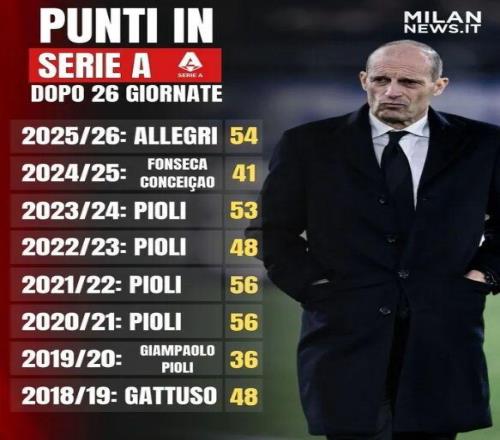 統計丨最近幾賽季26輪積分對比 米蘭圈 2026-02-25 10:17:00 米蘭圈本賽季AC米蘭在前26輪意甲過后積分54分,此數據比上賽季同期提升明顯,以下為近幾個賽季AC米蘭在26輪后同期積分情況:25/26賽季,阿萊格里執教,54分24/25賽季,豐塞卡執教,41分23/24賽季,皮奧利執教,53分22/23賽季,皮奧利執教,48分21/22賽季,皮奧利執教,56分20/21賽季,皮奧利執教,56分19/20賽季,詹保羅、皮奧利執教,36分18/19賽季,加圖索執教,48分意甲免費觀看_詹保羅免費觀看_AC米蘭免費觀看_意甲高清在線_詹保羅高清在線_AC米蘭高清在線 意甲 詹保羅 AC米蘭 斯蒂法諾·皮奧利 馬西米利亞諾·阿萊格里 上一篇: 數據丨莫德里創本賽季意甲紀錄 下一篇: 齊沃:如果我們能先進球比賽會不同我們必須承認對手的優秀