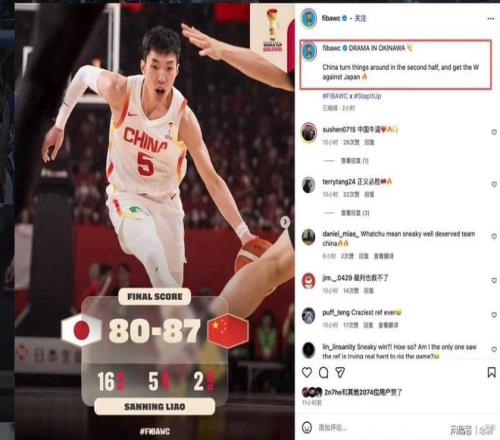 FIBA世界杯官方賬號在報道這場比賽的比分時寫道:”China with a sneaky win over Japan”,翻譯過來就是“中國隊偷偷摸摸地戰(zhàn)勝了日本隊。”