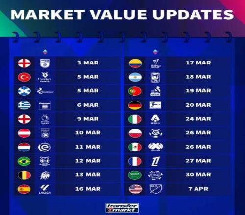 德轉(zhuǎn)身價更新時間:英超3月9日,西甲3月16日,德甲3月20日 懂球帝 2026-02-28 16:17:11 北京時間2月28日凌晨,德國轉(zhuǎn)會市場公布了各聯(lián)賽球員最新一期身價的更新時間,其中英超將在3月9日公布,西甲在3月16日公布,德甲在3月20日公布,意甲在3月24日公布,法甲在3月27日公布。德轉(zhuǎn)各聯(lián)賽球員身價更新預(yù)告:英冠 3月3日土超 3月5日蘇超 3月6日英超 3月9日奧地利超 3月10日荷甲 3月11日巴甲 3月12日比甲 3月13日西甲 3月16日哥倫比亞超 3月17日阿超 3月18日葡超 3月19日德甲 3月20日意甲 3月24日波超 3月26日墨超 3月26日法甲 3月27日沙超 3月30日美職聯(lián) 4月7日【上咪咕獨家看英超】西甲免費觀看_英超免費觀看_德甲免費觀看_西甲高清在線_英超高清在線_德甲高清在線 西甲 英超 德甲 法甲 意甲 葡超 荷甲 3月9日 德轉(zhuǎn)身價 上一篇: 衛(wèi)報:全英超都在圍剿阿森納,唯一解法是頂著壓力拿下冠軍 下一篇: 加納喬再惹爭議:賽前曬“嗜血雄獅”遭群嘲,切爾西或?qū)⑵淝逑?/a>