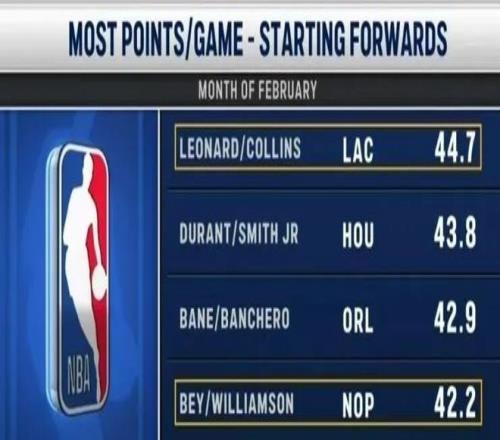 快船擁有整個二月得分最強的鋒線組