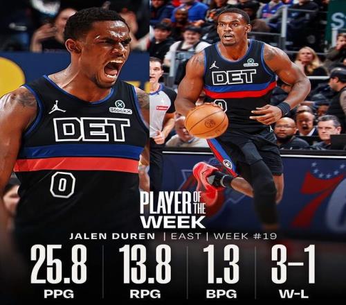 過去一周,杜倫場(chǎng)均25.8分13.8籃板,投籃命中率63.9%,幫助活塞打出3勝1負(fù)的戰(zhàn)績(jī)。