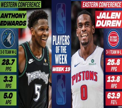 北京時(shí)間3月3日,NBA官方公布了第19周的周最佳球員,森林狼的愛德華茲當(dāng)選西部周最佳球員,這是他本賽季首次當(dāng)選,也是生涯第三次當(dāng)選。活塞的杜倫當(dāng)選東部周最佳球員,這是他生涯首次獲得這一獎(jiǎng)項(xiàng)。