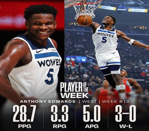 過去一周,愛德華茲率領(lǐng)森林狼取得3勝0負(fù)的戰(zhàn)績(jī),場(chǎng)均28.7分3.3籃板5.0助攻。