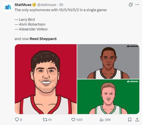 申京賽后談到謝潑德此役的表現,申京說:謝潑德實在是太棒了,攻防兩端都對球隊有巨大的貢獻。