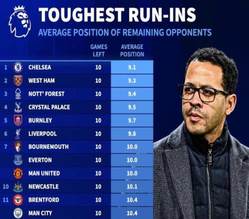 德轉(zhuǎn)統(tǒng)計(jì)本賽季英超最后10輪各隊(duì)對手平均排名: