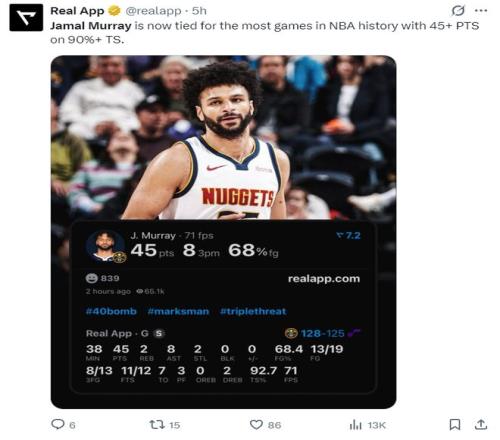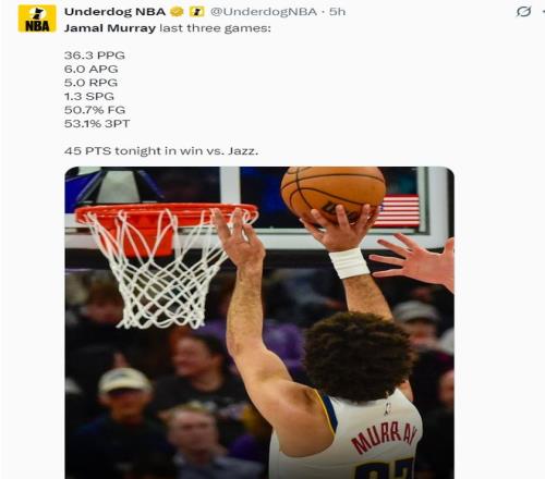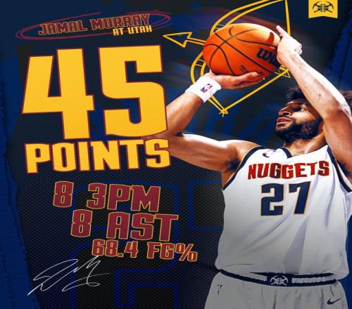 他在第三節三分7中5拿到18分1搶斷,末節2中2+罰球6中6拿到10分,整個下半場拿到28分。而約基奇全場比賽只拿到22分12籃板5助攻,此役掘金就是靠穆雷才拿下的。