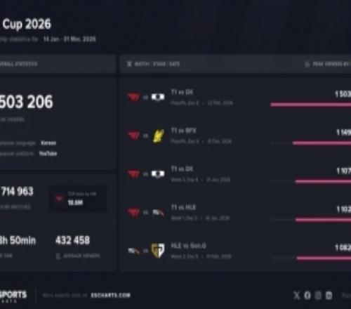 外媒統計LCK杯觀眾峰值前五:T1包攬前四,決賽未進入前五 大精靈 2026-03-03 22:42:01 電競體育3月3報道 外媒統計?LCK杯觀眾峰值排名前五的比賽,具體如下:1?、敗者組半決賽T1?2-3?DK:150萬32062?、勝者組次輪T1?1-3?BFX:114萬98423?、常規賽第三周T1?3-0?DK:110萬76624?、常規賽首周T1?2-1?HLE:110萬26755?、常規賽第三周GEN?3-0?HLE:108萬2462值得一提的是?,LCK杯決賽GEN以3-0擊敗BFX奪冠的比賽未能進入觀眾峰值前五名。電競免費觀看_游戲免費觀看_英雄聯盟免費觀看_電競高清在線_游戲高清在線_英雄聯盟高清在線 電競 游戲 英雄聯盟 LPL LCK T1 GEN BFX 上一篇: LPL單場歷史第一!Creme使用斯莫德斬獲單場2031分均傷害 下一篇: GEN為Chovy送上生日祝福:HappyChovyDay