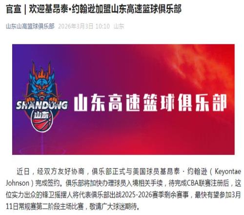 山東男籃官方公告寫道:“經雙方友好協商,俱樂部正式與美國球員基昂泰-約翰遜完成簽約。俱樂部將加快辦理球員入境相關手續,待完成CBA聯賽注冊后,這位實力出眾的鋒衛搖擺人將代表俱樂部出戰2025-2026賽季剩余賽事,最快有望參加3月11日常規賽第二階段主場比賽,敬請廣大球迷期待。”