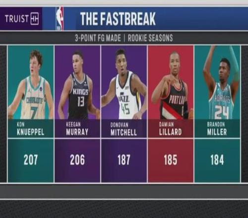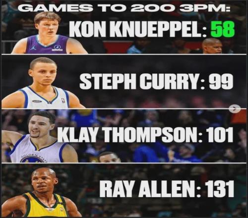 細致到個人數據方面,庫里在新秀賽季立刻獲得主力首發位置,場均出場36分鐘,克努佩爾同樣獲得首發位置,目前場均出場32分鐘,在出場時間方面落后四分鐘,但在場均三分出手方面,克努佩爾占了大優勢,庫里新秀賽季場均三分僅出手4.8次,在當時的籃球環境下,沒有教練會允許一個新秀球員大量三分出手,一個球員如果選擇直接持球三分出手甚至會立刻遭到教練痛斥,而克努佩爾完全沒有這種限制,他在一支重建隊,現在教練甚至會鼓勵球員在三分線外有機會就投,所以克努佩爾的場均三分出手次數高達8次,在全聯盟排名第12,他之所以能打破新秀三分命中記錄,是天時地利人和的完美結合.