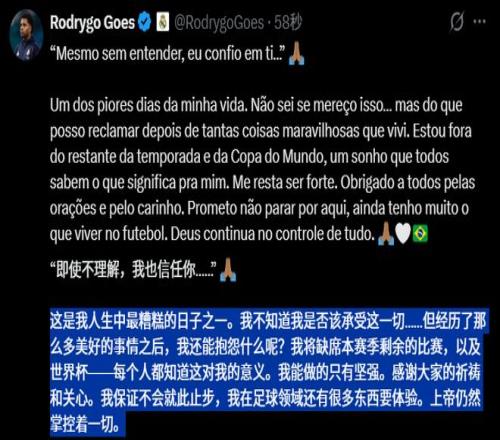 皇馬確認(rèn)羅德里戈遭遇右膝前十字韌帶斷裂外加外側(cè)半月板斷裂的重傷,球員本人在社媒發(fā)聲,表態(tài)自己缺席世界杯,但自己不會(huì)就此止步。