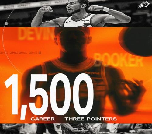 此役布克完成常規賽1500三分大關,他在720場或更少的比賽中拿到17000分+1500三分歷史第三,比肩庫里、利拉德。布克全場比賽19中6,三分9中4僅拿到17分6助攻4籃板3失誤。