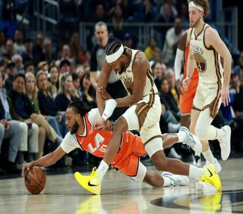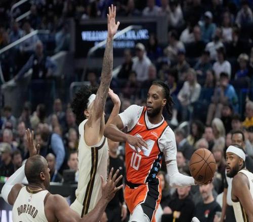 上半場,就是另外的極端。萊昂納德和加蘭的上場時間被錯開,天賦平庸的加蘭,又被扔到了單核帶隊的環境。只能說,加蘭確實扛起了球星的責任,但他實在很難做出實質的貢獻。他只會在勇士兇悍的夾擊撕咬下,不停地失誤。他只會在兇狠的一線領防下,不斷三分打鐵。在前赴后繼的圍剿下,加蘭只會暴露天賦的平庸,組織能力優秀的特點發揮不出來,一個人幾乎帶崩快船整支球隊。