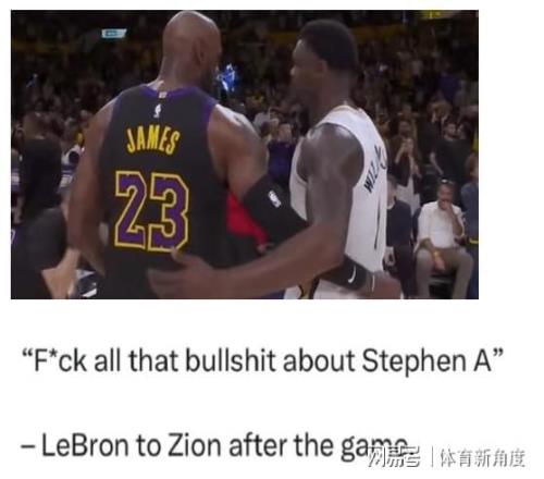 在今日進行的一場賽事中,湖人隊以110-101的比分逆轉戰勝鵜鶘隊。賽后,詹姆斯與對方球員錫安進行了擁抱致意。據美國媒體披露,詹姆斯在交流中情緒失控,爆出粗口,對錫安直言:“去他的斯蒂芬·A的那些無稽之談。”