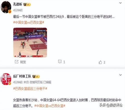 前三節,中國女籃一度取得19分的領先優勢,但在第四節的后半段,隨著巴西女籃突然上防守強度,中國女籃顯得非常不適應,張子宇3罰不中,羅欣棫2罰1中,中國女籃連續送給巴西反擊的機會,隨著馬丁斯超遠三分命中,留給中國女籃僅剩0.2秒的時間。