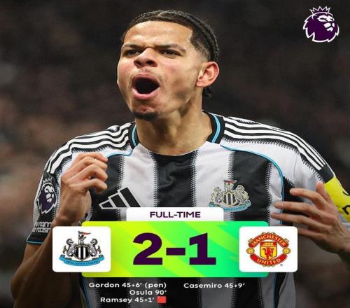 直到比賽第90分鐘,曼聯進攻被斷,喜鵲軍團快速反擊,奧蘇拉奔襲內切得分,紐卡2-1絕殺!