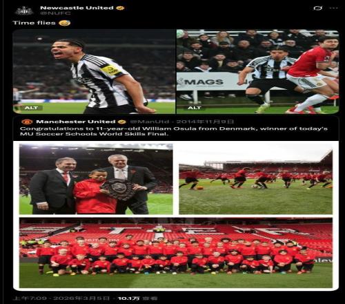奧蘇拉12年前曾贏得曼聯足球學校技能賽冠軍,如今絕殺曼聯 懂球帝 2026-03-05 17:30:10 英超第29輪,紐卡斯爾聯主場2-1擊敗曼聯,22歲紐卡前鋒奧蘇拉攻入絕殺進球。賽后,紐卡官方“挖墳”,找出了曼聯官方社媒發布的奧蘇拉在12年前贏得曼聯足球學校技能賽冠軍的帖子。2014年11月,11歲的奧蘇拉贏得了曼聯足球學校世界技能賽冠軍。曼聯官方社媒當時發布了帖子和照片。如今,奧蘇拉代表紐卡斯爾聯在對陣曼聯的比賽中打入絕殺進球。賽后,紐卡官方轉發了曼聯當年的帖子,并配文:“時光飛逝”【上咪咕獨家看英超】足球免費觀看_曼聯免費觀看_英超免費觀看_足球高清在線_曼聯高清在線_英超高清在線 足球 曼聯 英超 奧蘇拉 技能賽 紐卡斯爾隊 上一篇: 拉門斯:像今天這樣出現集體性的狀態掉線是絕對無法被接受的 下一篇: 【英超】阿森納領跑7分!槍手勝,曼城平保級隊