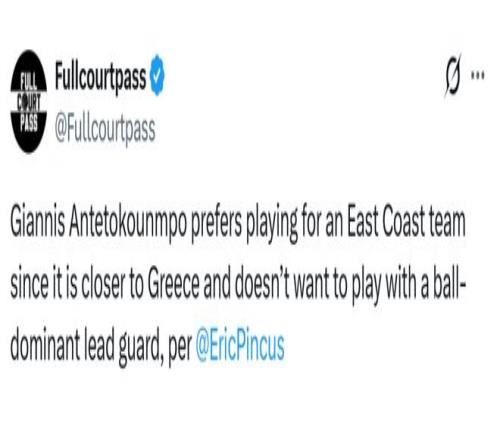 Pincus在文中指出,字母哥更偏愛東海岸,那里距離希臘更近(無論是飛行距離還是時(shí)區(qū))。有人稱,字母哥懷念和霍勒迪、米德爾頓搭檔的日子,那是他2021年奪冠的隊(duì)友。這并不意味著他想重組當(dāng)年陣容,只是字母哥不希望和大量持球的核心控衛(wèi)搭檔,他更想成為球隊(duì)進(jìn)攻的絕對(duì)發(fā)動(dòng)機(jī)(霍勒迪和米德爾頓都能無球配合他)。