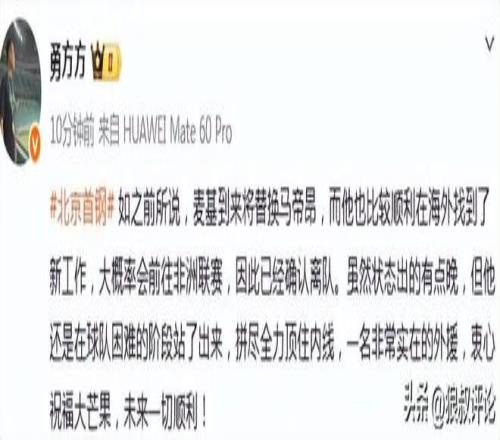 北京時間3月5日,根據(jù)媒體人“勇方方”的報道,麥基到來將替換馬帝昂,而他也比較順利在海外找到了新工作,大概率會前往非洲聯(lián)賽,因此已經(jīng)確認(rèn)離隊。雖然狀態(tài)出的有點晚,但他還是在球隊困難的階段站了出來,拼盡全力頂住內(nèi)線,一名非常實在的外援,衷心祝福大芒果,未來一切順利! 。