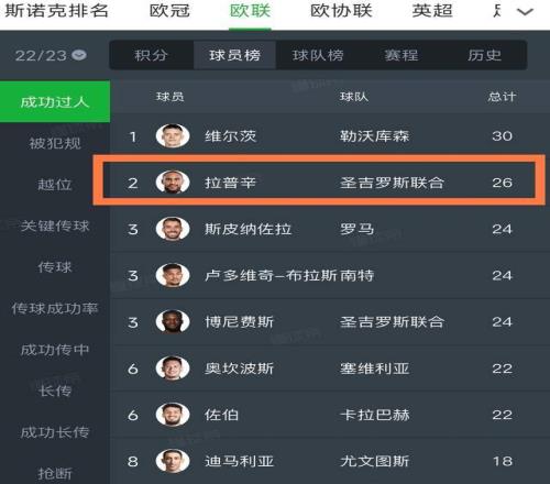 第二個,拉普辛還是歐聯(lián)杯助攻王,22到23賽季,他在歐聯(lián)杯完成4次助攻,并列那個賽季歐聯(lián)杯的助攻王,而且也是歐聯(lián)杯成功過人榜第2名,第1名是誰呢?就是現(xiàn)在身價1.1億歐的利物浦球星維爾茨。