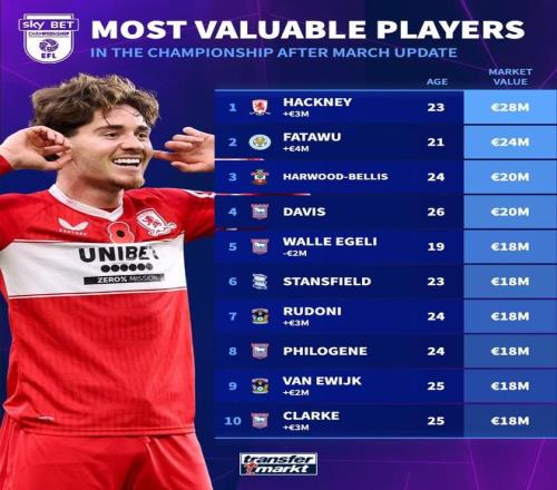 北京時間3月5日,在更新了英冠球員的身價之后,德轉統計出了此次更新之后英冠身價最高的10名球員,米德爾斯堡中場哈克尼2800萬歐元排名第一,萊斯特城邊鋒法塔武2400萬歐元第二。