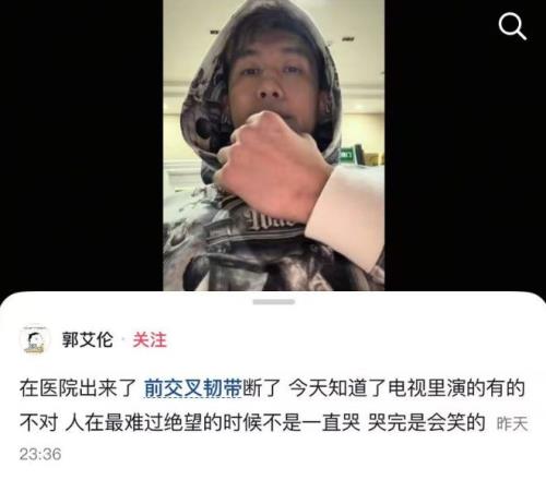 郭艾倫也在個人社交平臺回應(yīng)傷情:“在醫(yī)院出來了,前交叉韌帶斷了,今天知道了電視里演的有的不對,人在最難過絕望的時(shí)候不是一直哭,哭完是會笑的。”