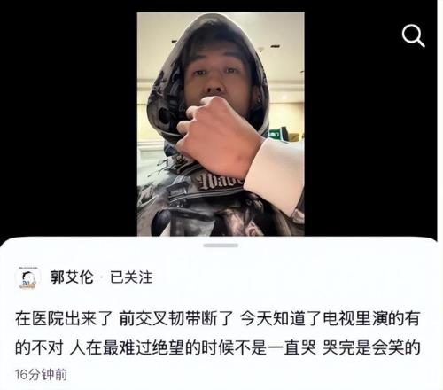 比賽結束之后,郭艾倫在個人社交賬號上發布了一條視頻,專門回應了自己的情況,并官宣了傷情:前交叉韌帶斷了。