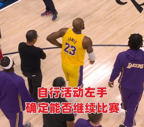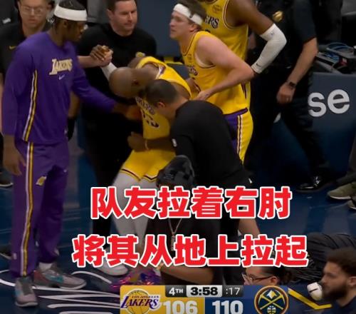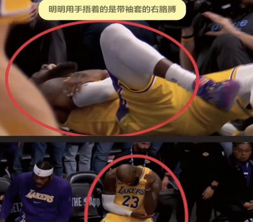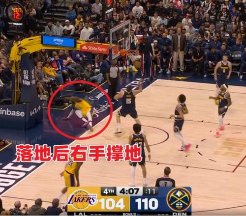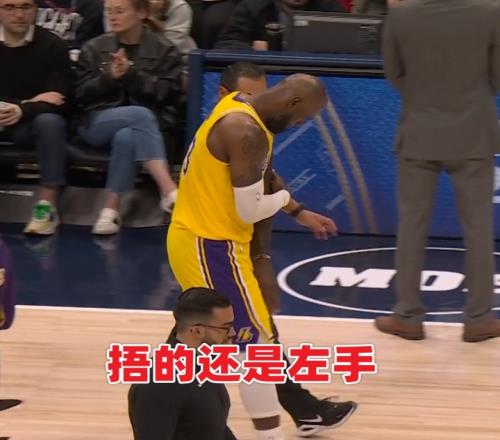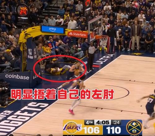 本場第四節4分10秒左右,詹姆斯三分線外持球沖擊約基奇上籃命中,隨后失衡落地肘部受傷。有球迷稱詹姆斯為何右手落地但卻捂著左肘,一會捂著右邊一會捂著左邊,是傷病轉移了?還是演戲博同情?