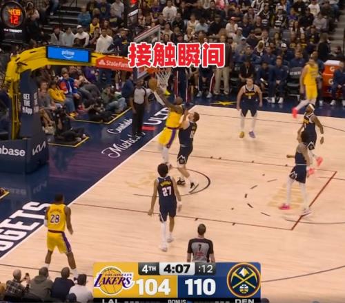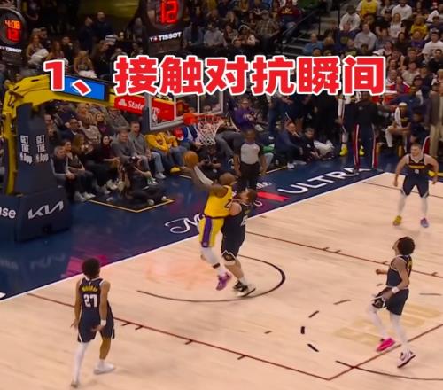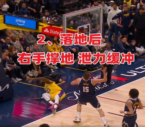 2、慢鏡頭(高角度)顯示,上籃時接觸到了約基奇的左肩,左肘在落地/受力瞬間發生快速旋轉,隨后詹姆斯立即用右手捂住左肘并表現出痛苦表情。