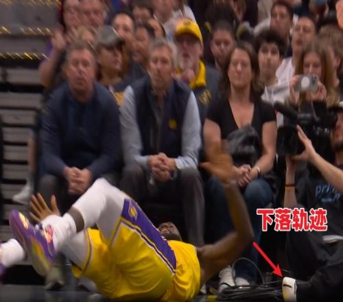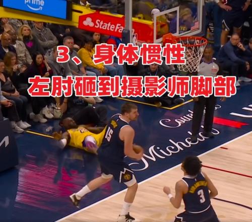 1、比賽直播/轉播視角顯示,詹姆斯上籃對抗約基奇后失衡倒地,他右手撐地、隨后順勢泄力,依靠身體慣性左肘砸到了場邊攝影師的鞋子上。