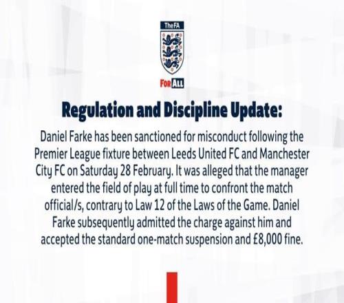 官方:利茲聯主帥法爾克因對曼城賽后與裁判對峙被停賽一場 懂球帝 2026-03-06 20:51:16 北京時間3月6日,英足總官方發布公告宣布,利茲聯主帥法爾克因為在對陣曼城的比賽結束后沖進球場與裁判對峙被禁賽一場外加罰款8000英鎊。英足總官方公告:丹尼爾-法爾克因在2月28日利茲聯與曼城的英超比賽后行為不當而受到處罰,據稱,這位教練在比賽結束時進入場地與比賽官員對峙。這違反了英足總《比賽規則》第12條,丹尼爾-法爾克隨后承認了對他的指控,并接受了標準的一場比賽禁賽和8000英鎊的罰款。【上咪咕獨家看英超】曼城免費觀看_英超免費觀看_停賽免費觀看_曼城高清在線_英超高清在線_停賽高清在線 曼城 英超 停賽 利茲聯 丹尼爾 馬蒂亞斯·法爾克 上一篇: 電訊報:阿森納、曼聯和藍軍今夏將爭奪富勒姆18歲中衛阿米薩 下一篇: 還是卡里克云集英超三大豪門,阿森納又缺席,四大候選全部不勝
