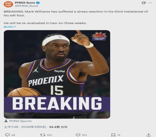 此役過后,太陽35勝27負仍居西部第7,落后第6的湖人2個勝場,領先第8的勇士3個勝場。今天賽前,太陽官方宣布:球隊中鋒馬克-威廉姆斯左腳第三跖骨出現應力反應,將在2-3周之后接受重新評估。常規賽能否復出,都是未知數。