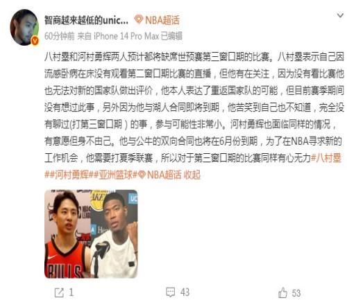 至于日本男籃的后場核心球員河村勇輝也是類似的情況:“河村勇輝也面臨同樣的情況,有意愿但身不由己。他與公牛的雙向合同也將在6月份到期,為了在NBA尋求新的工作機會,他需要打NBA夏季聯賽,所以對于第三窗口期的比賽,同樣有心無力。”