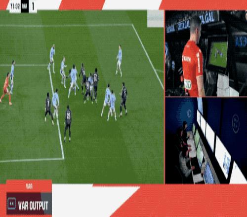 第70分鐘,主裁判叫停比賽,VAR介入,慢鏡頭顯示韋特格拉在本方禁區(qū)內(nèi)明顯手球,但瓊阿梅尼有一個推人的動作,裁判示意沒有點球。