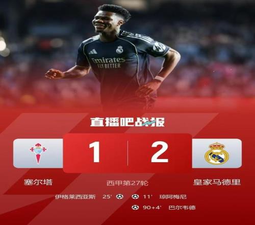 之后的七十多分鐘里雙方互有攻防卻都難再破門得分,就當(dāng)所有人都以為本場將以平局收場之際,巴爾韋德再度展現(xiàn)了他超硬的腳頭,提前一步搶到塞爾塔解圍不遠的皮球,隨后調(diào)整一步施展穿云箭,皮球在經(jīng)過多次折射后破門得分完成讀秒絕殺,為皇馬驚險搶下三分。