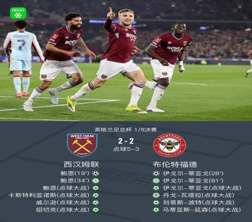 北京時間3月10日英格蘭足總杯 1/8決賽,西漢姆聯對陣布倫特福德。西漢姆聯鮑恩梅開二度。布倫特福德伊戈爾-蒂亞戈梅開二度。最終比分西漢姆聯 7-5 布倫特福德。