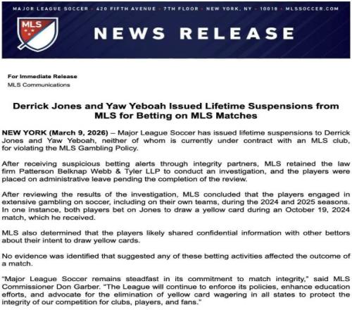 北京時間3月10日,據TA、ESPN、BBC等多家媒體報道,美國職業大聯盟宣布,曾效力于美職聯的兩名球員德里克·瓊斯和葉博亞因參與涉及美職聯比賽的賭博活動被美職聯處以終身禁賽。
