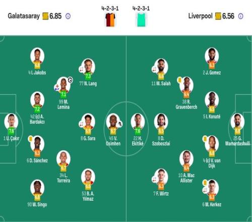 加拉塔薩雷首發:1-恰基爾、4-伊斯梅爾·雅各布斯、42-巴爾達克徹、6-達文森·桑切斯、90-辛格、99-勒米納(77'11-阿克金)、34-托雷拉(93'17-埃爾馬利)、77-諾阿·朗(77'7-紹洛伊)、8-薩拉(87'93-博伊)、53-伊爾馬茲(93'20-京多安)、45-奧斯梅恩