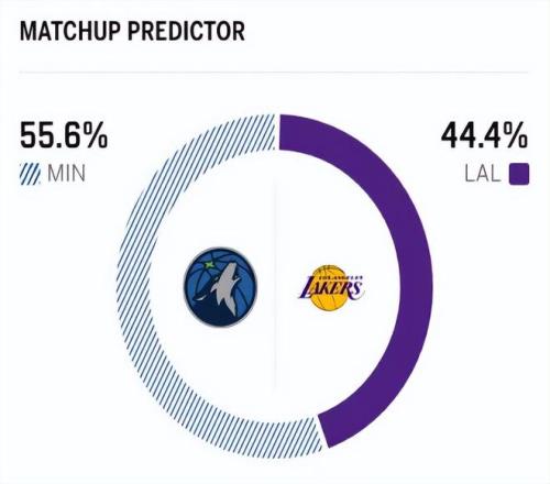賽前,美媒ESPN對(duì)本場(chǎng)比賽進(jìn)行了勝率預(yù)測(cè),森林狼隊(duì)勝率55.6% ,湖人勝率則僅有44.4% ,劣勢(shì)明顯 。