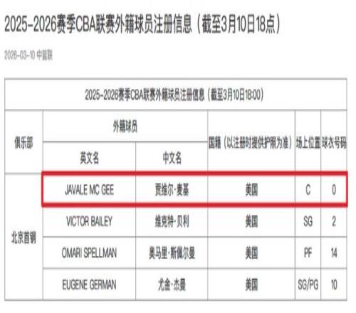 北京時間3月10日,CBA官方公布最新外援注冊情況,北京男籃已經為前NBA3冠中鋒麥基完成注冊,他將身穿0號球衣征戰CBA第二階段的比賽,有望在3月11日對陣四川男籃的比賽迎來加盟首秀。
