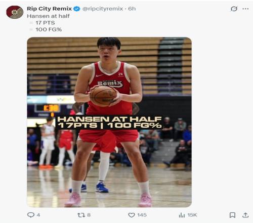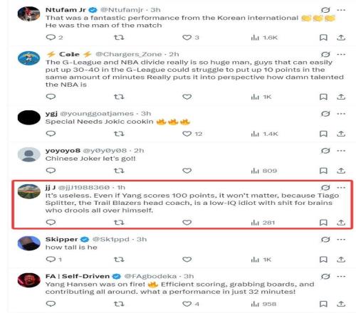 但有一位開拓者球迷寫道:沒用的,就算楊瀚森在G聯賽拿到100分也沒用,因為開拓者主帥斯普利特是一個低智商、愚蠢的主帥,他不會給楊瀚森機會的。