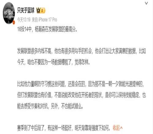 國內也有很多的博主認為楊瀚森的進步是肉眼可見的,但他的力量、腳步、防守習慣、體能這些軟肋還需要提升,如今的他在NBA打一個輪換還是有希望的。