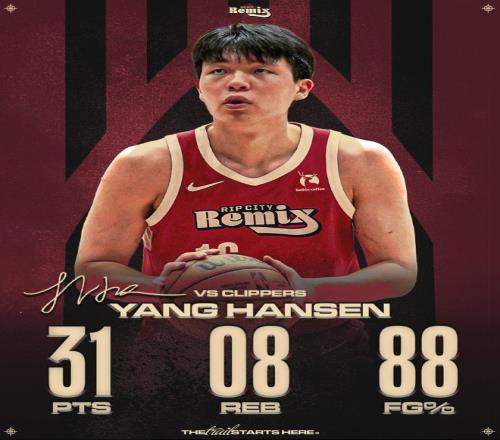 第三節的楊瀚森依舊是4中4拿到10分,三節打完12中12拿到27分,楊瀚森創造了個人G聯賽的連續命中紀錄,全場比賽31分鐘,16中14,三分1中1,拿到31分8籃板3助攻1搶斷1蓋帽僅1失誤,命中率88%,三分命中率100%。