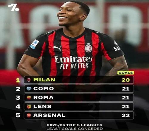 根據數據統計,米蘭是本賽季五大聯賽迄今為止丟球最少的球隊,紅黑軍團僅丟了20球,位居其后的是科莫、羅馬及朗斯的21球,阿森納以22球位居第5。