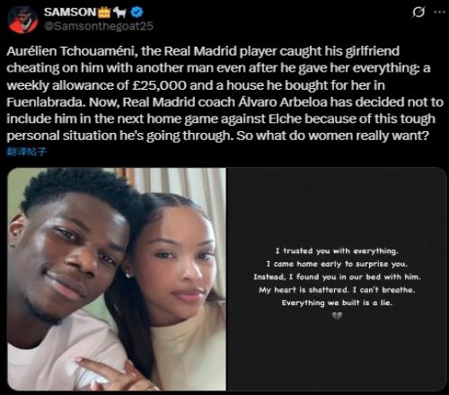 該博主仿造了瓊阿梅尼的社媒截圖,并寫道:瓊阿梅尼發現女友出軌,盡管他已經為她付出了一切:每周2.5萬英鎊的生活費,還為她購置了一套房產。如今,阿韋洛亞決定不讓瓊阿梅尼參加對埃爾切的比賽,因為他正經歷著這段艱難的個人時期。