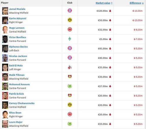 1、穆西亞拉(拜仁) 下跌1000萬歐至1.3億歐