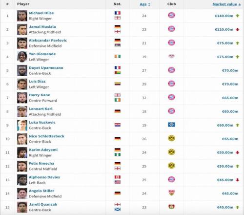 奧利塞以1.4億歐身價領跑德甲,穆西亞拉1.2億歐次之,帕夫洛維奇與揚-迪奧曼德以7500萬歐的身價并列第三。