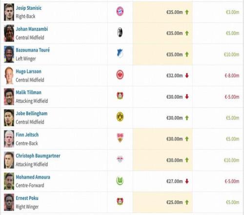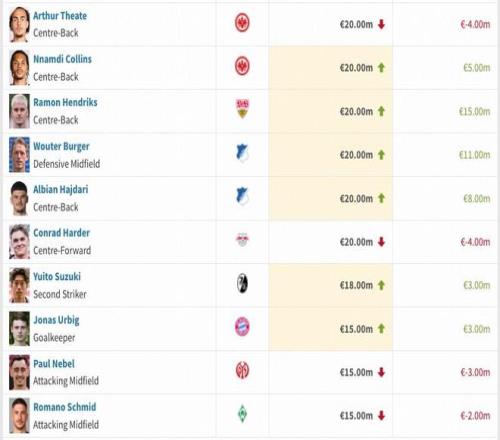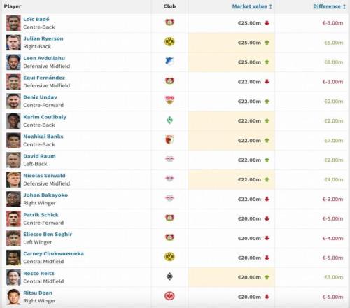 僅兩名球員下跌達到1000萬歐,分別是拜仁慕尼黑前腰穆西亞拉和多特蒙德邊鋒阿德耶米。