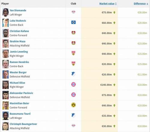 本期德甲有12名球員身價上漲超1000萬歐,其中揚-迪奧曼德上漲3000萬歐最多,武什科維奇2000萬歐,勒沃庫森隊科法內上漲1800萬歐,馬扎上漲1500萬歐,斯圖加特隊萊韋林與亨德里克斯均上漲1500萬歐。