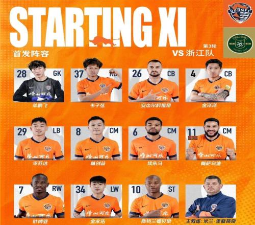浙江隊陣型為352:門將是趙博,三中衛是隊長波西諾洛,劉浩帆和徐俊馳。前場:米特里策、孫國文打兩個邊前衛。樸鎮燮、托利奇和鮑盛鑫組成三中場。前鋒是王鈺棟和瓜里拉帕。