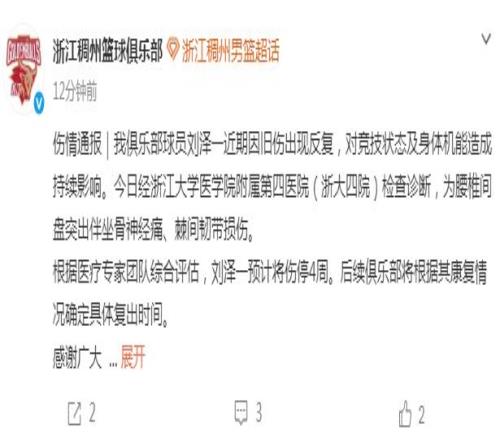 北京時(shí)間3月21日,浙江男籃官方公布球隊(duì)本土頂薪內(nèi)線劉澤一傷病情況,他近期因舊傷出現(xiàn)反復(fù),前往醫(yī)院檢查后確診為腰椎間盤(pán)突出伴坐骨神經(jīng)痛、棘間韌帶損傷,預(yù)計(jì)將傷停4周。